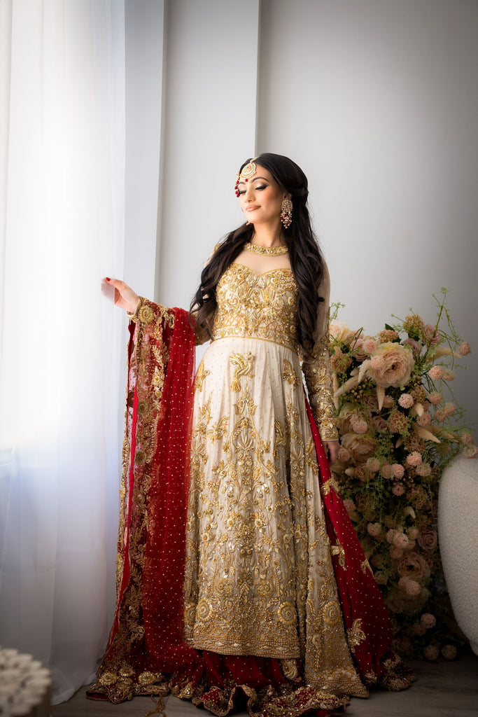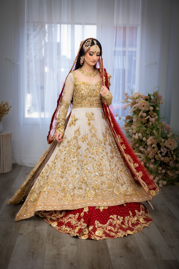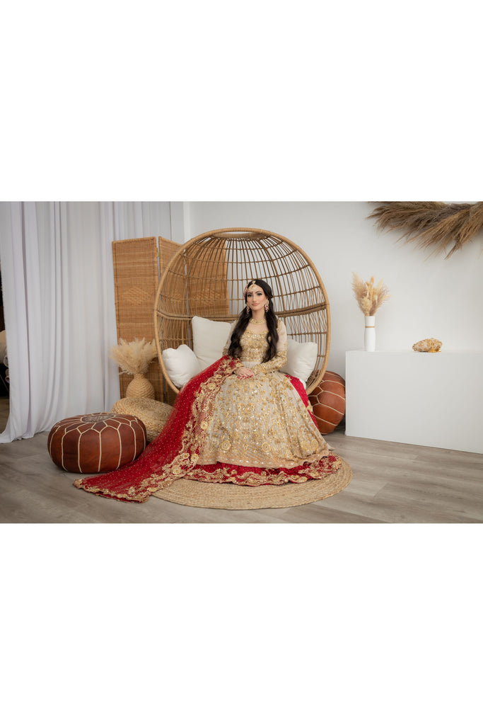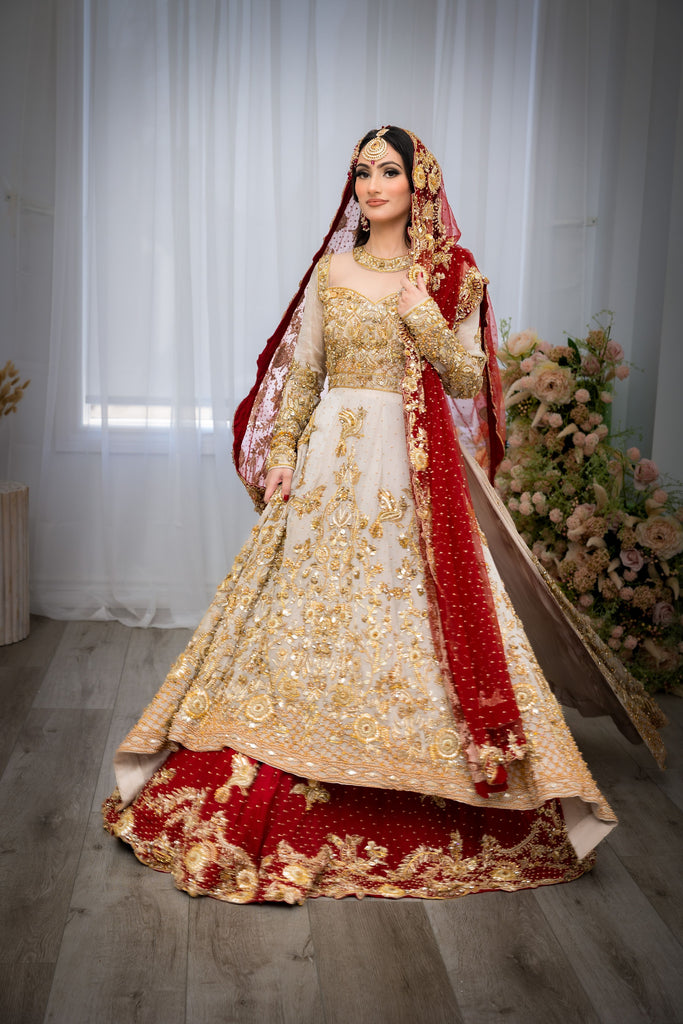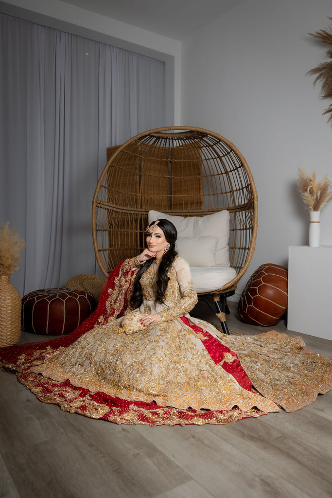 A perfectly picked red & gold bridal featuring a flowy silhouette with an accentuated A-line mesuri kameez paired with a two-toned deep scarlet silk lehenga. Lavishly embellished & decorated with a carefully curated gold garden of florals, vines, butterflies & birds - All handworked to perfection with crystals, gotta, pearls & zardozi. Complemented with a handworked scarlet red net dupatta.