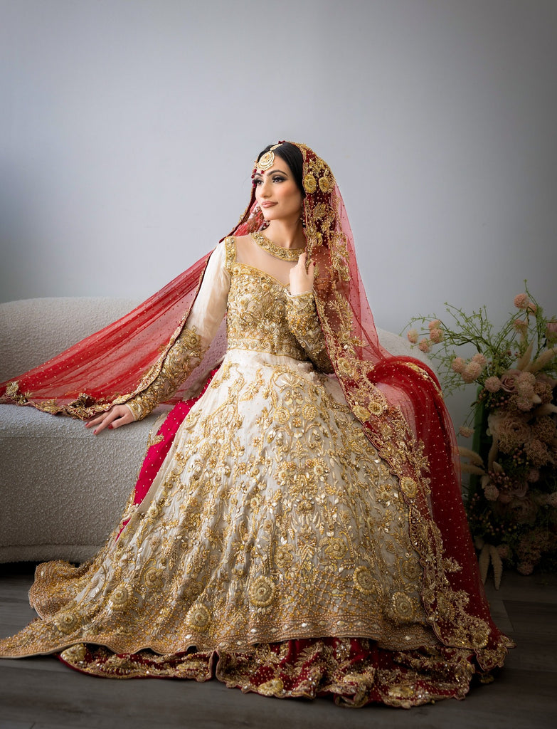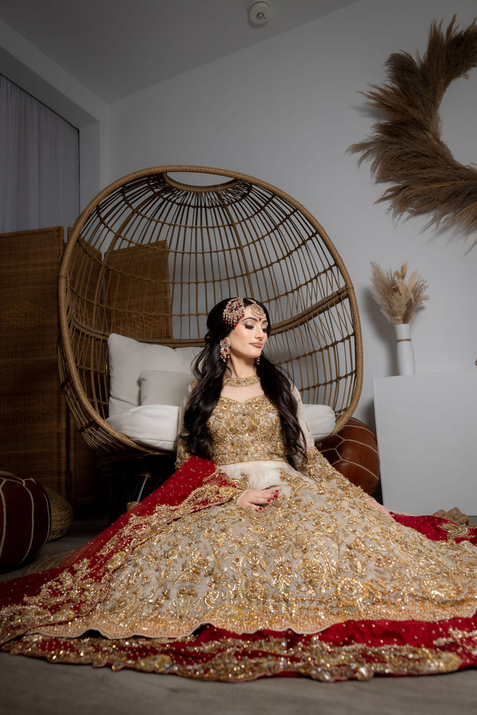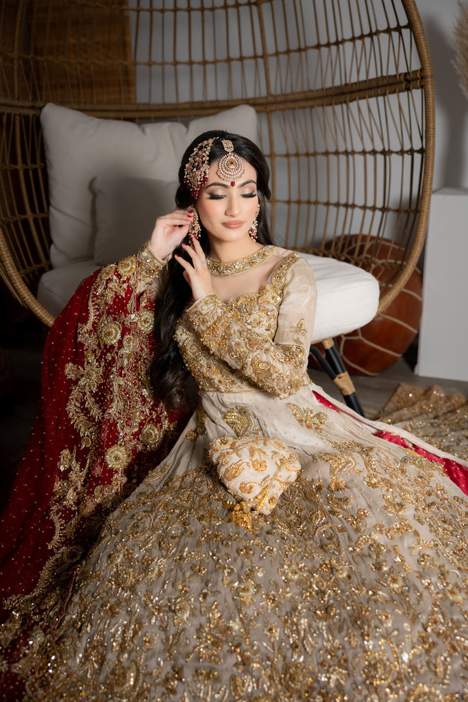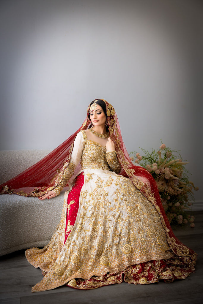 A perfectly picked red & gold bridal featuring a flowy silhouette with an accentuated A-line mesuri kameez paired with a two-toned deep scarlet silk lehenga. Lavishly embellished & decorated with a carefully curated gold garden of florals, vines, butterflies & birds - All handworked to perfection with crystals, gotta, pearls & zardozi. Complemented with a handworked scarlet red net dupatta.