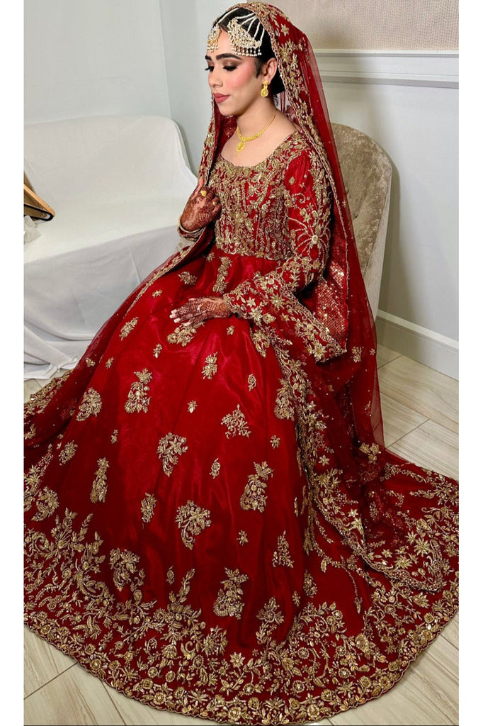 A beautiful shade of crimson red exquisitely hand worked in various motif designs on a 200” flare - heavily packed with zardozi, crystal & tilla work. Paired with a net dupatta with a abstract detailed handwork border & bootiyan throughout.