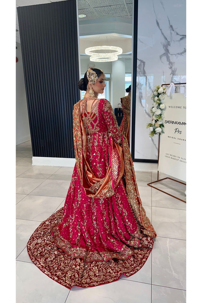 A graceful kameez crafted in ZQ’s signature custom-embroidered cotton net, embellished entirely by hand with exquisite zardozi, dabka, tilla, mukesh, and more. It is paired with a pure 5-metre tissue dupatta and a rich banarasi silk lehenga, finished with a pure velvet frill intricately handworked to perfection. The look is elevated with a statement cut-out back and high side slits, creating a stunning, flowing silhouette.