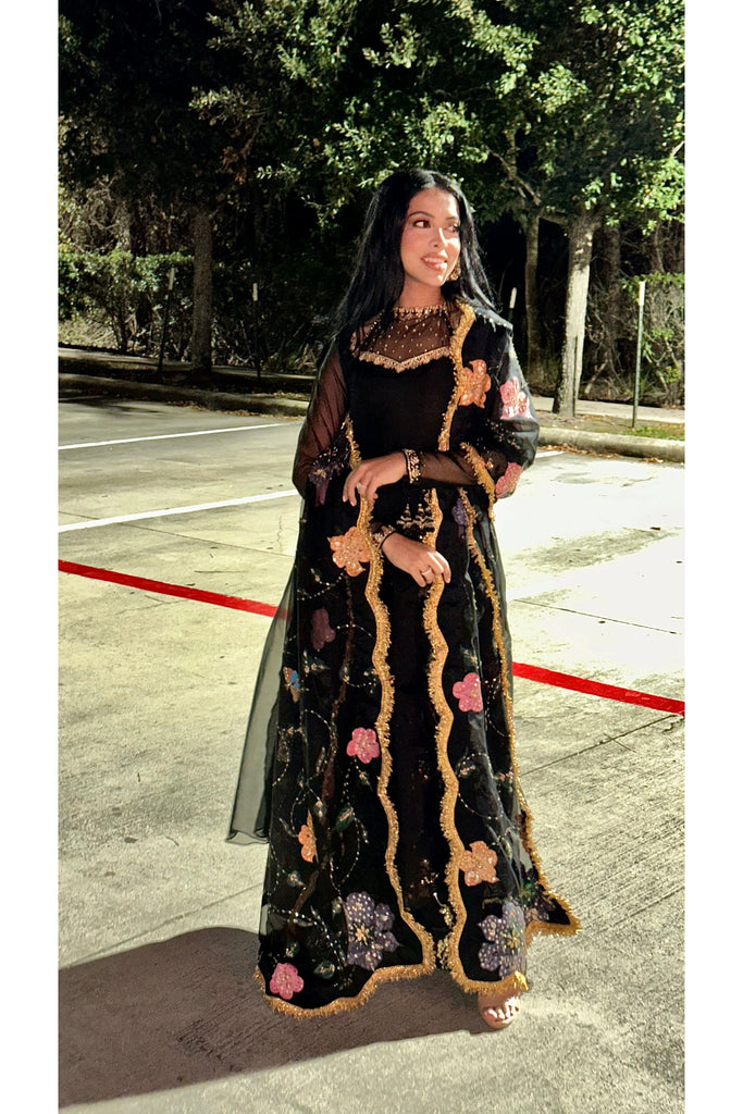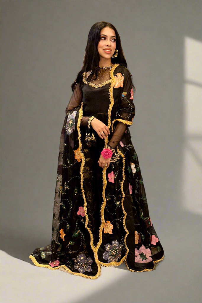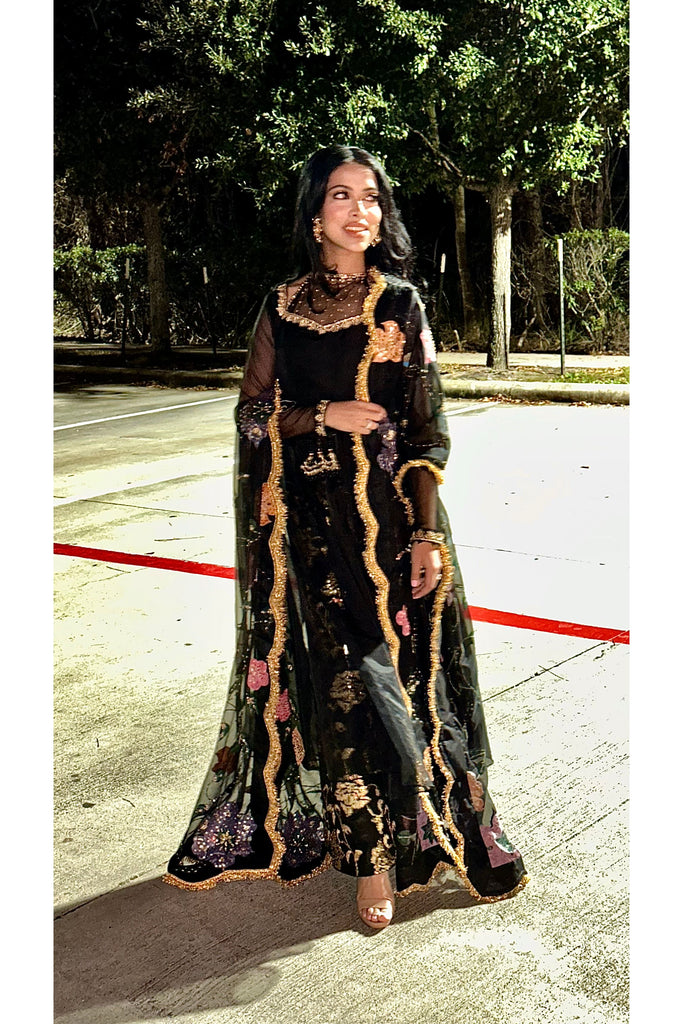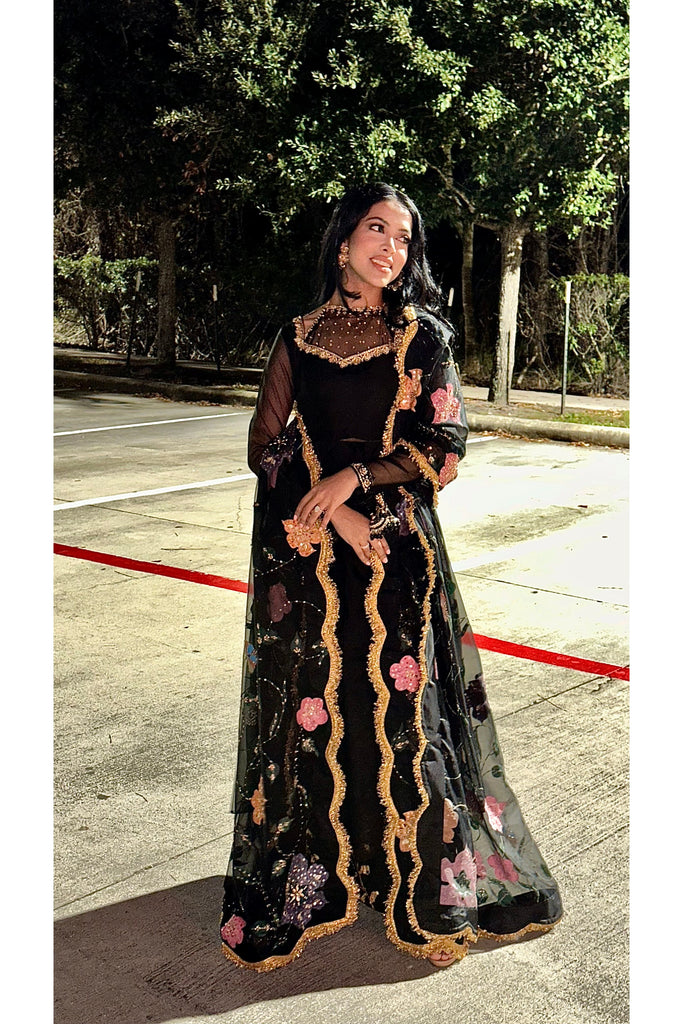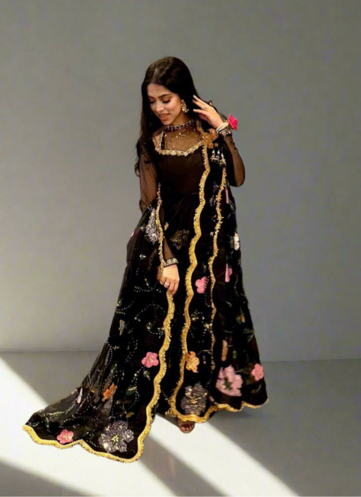 An ethereal organza peshwaas adorned with a delicately detailed neckline, styled with an optional removable choli showcasing a glimmering halter cut, intricately hand-embellished with sequins and rhinestones. Paired with wide-leg trousers featuring ZQ’s signature sequin craftsmanship, the look is completed with a showstopper dupatta—meticulously hand-painted, hand-embellished, and finished with a statement kiran lace.