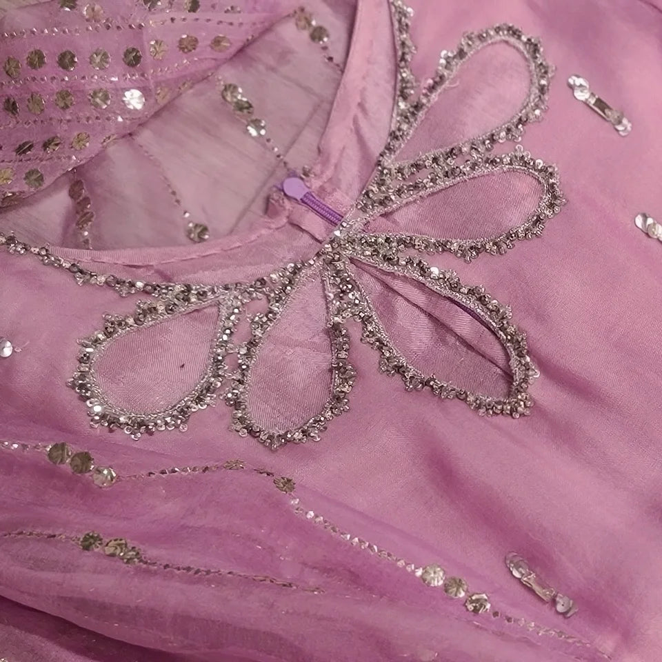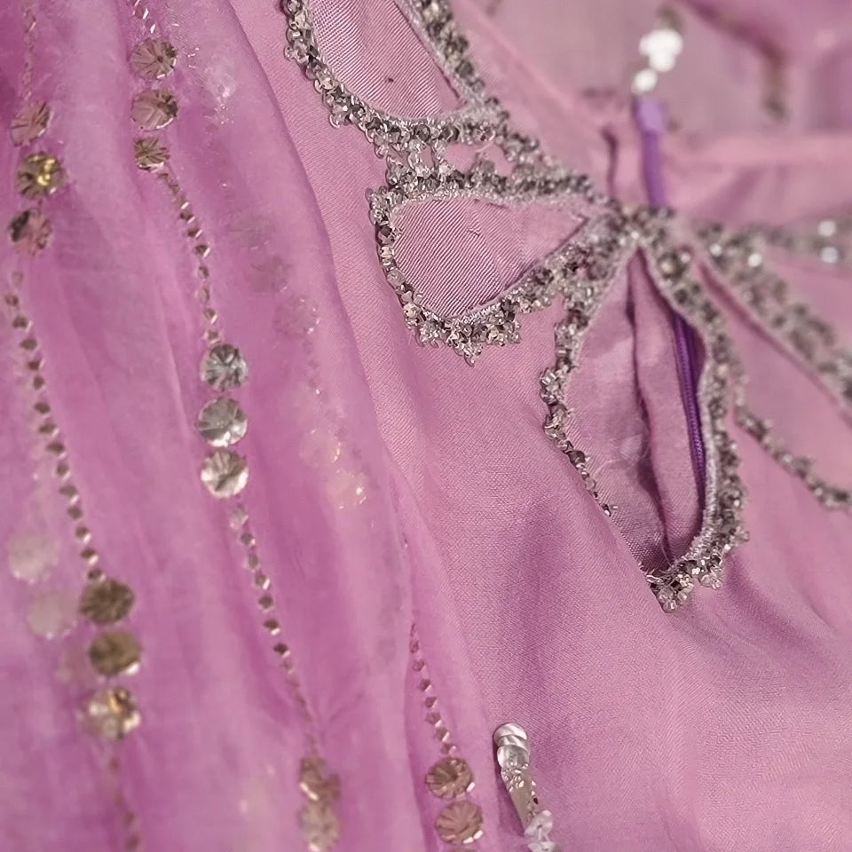 A lilac straight shirt featuring a statement beaded neckline with crystal droplets encrusted all over and shimmery beades tassles on the sleeves. Attached is a heavy draped mukesh dupatta which completes this look.
