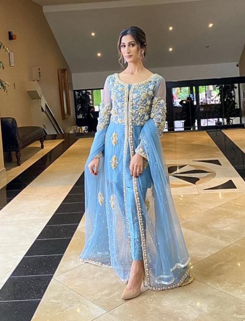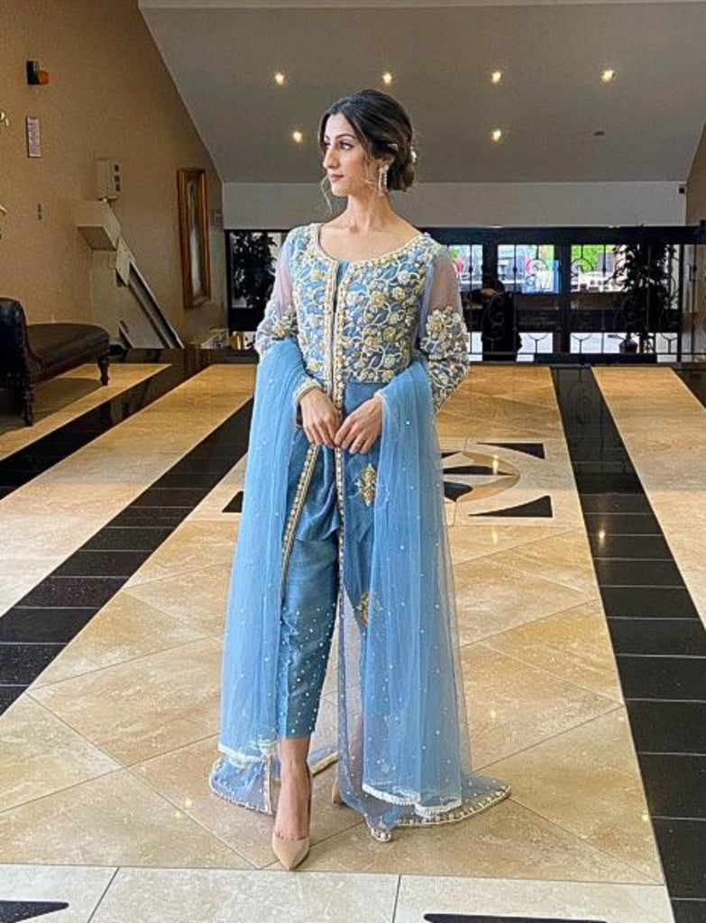 A maxi jacket silhouette in soft tulle heavily adorned in iridescent pearls, paired with raw silk cigarette pants & a short tunic. Completed with a jewelled belt.