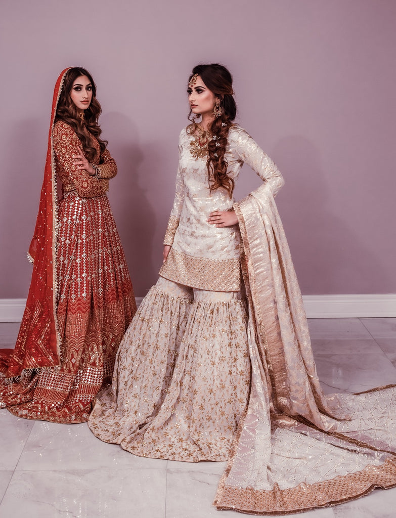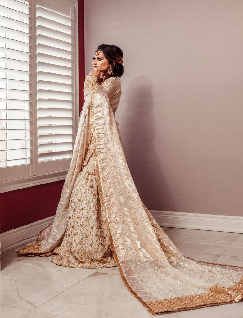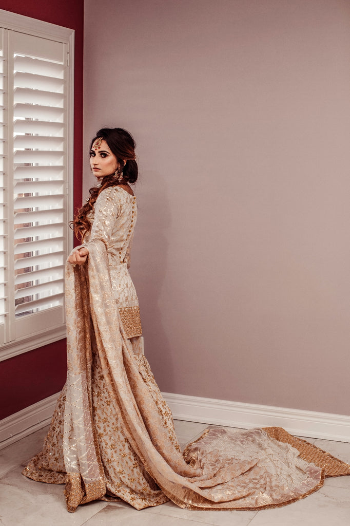A majestic white and gold bridal gharara designed using an array of pure shimmering fabrics. An ode to old world charm & the classic nikkah bride.