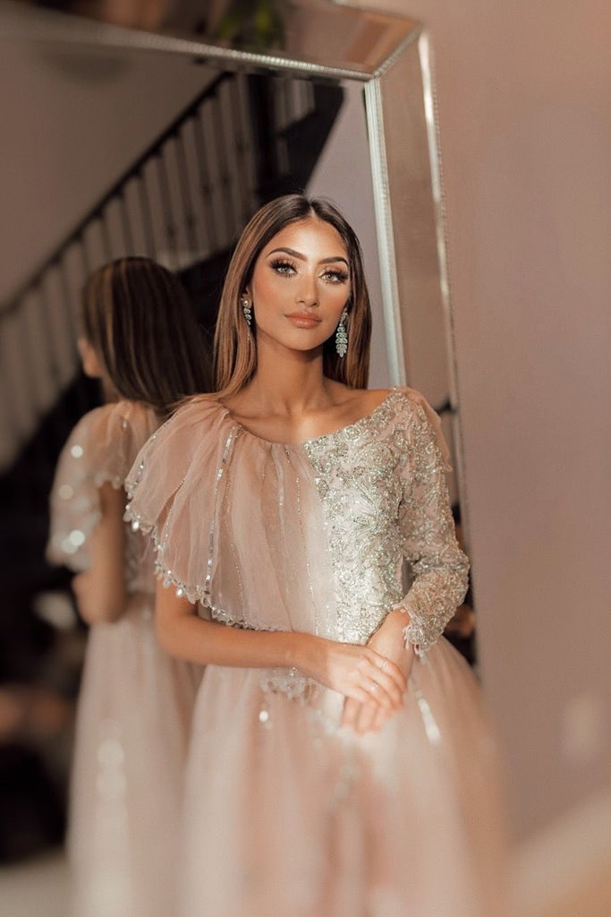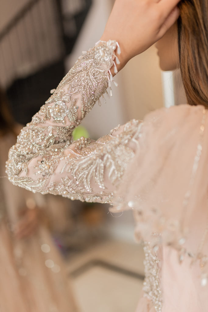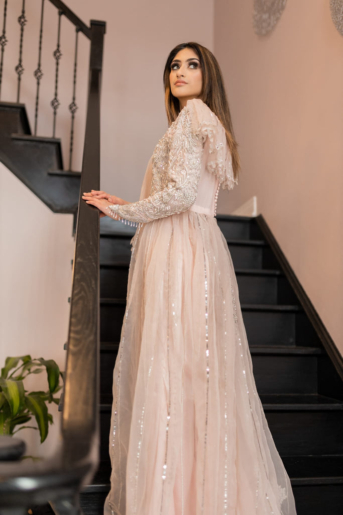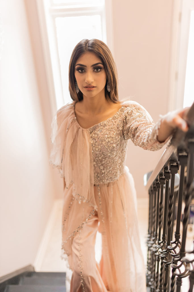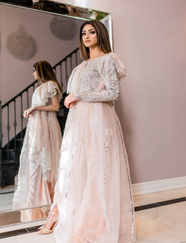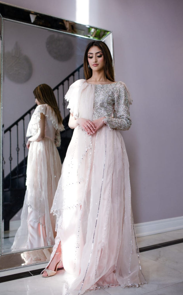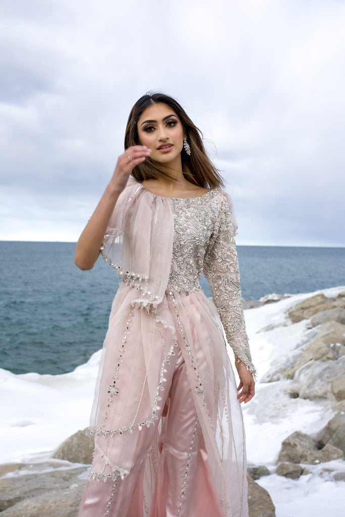 A soft hue of light pink organza stitched in a unique cascading ruffle silhouette. Embellished in intricate sparkling work, paired with a lustrous silk flared leg trouser that peaks through the side slit.
