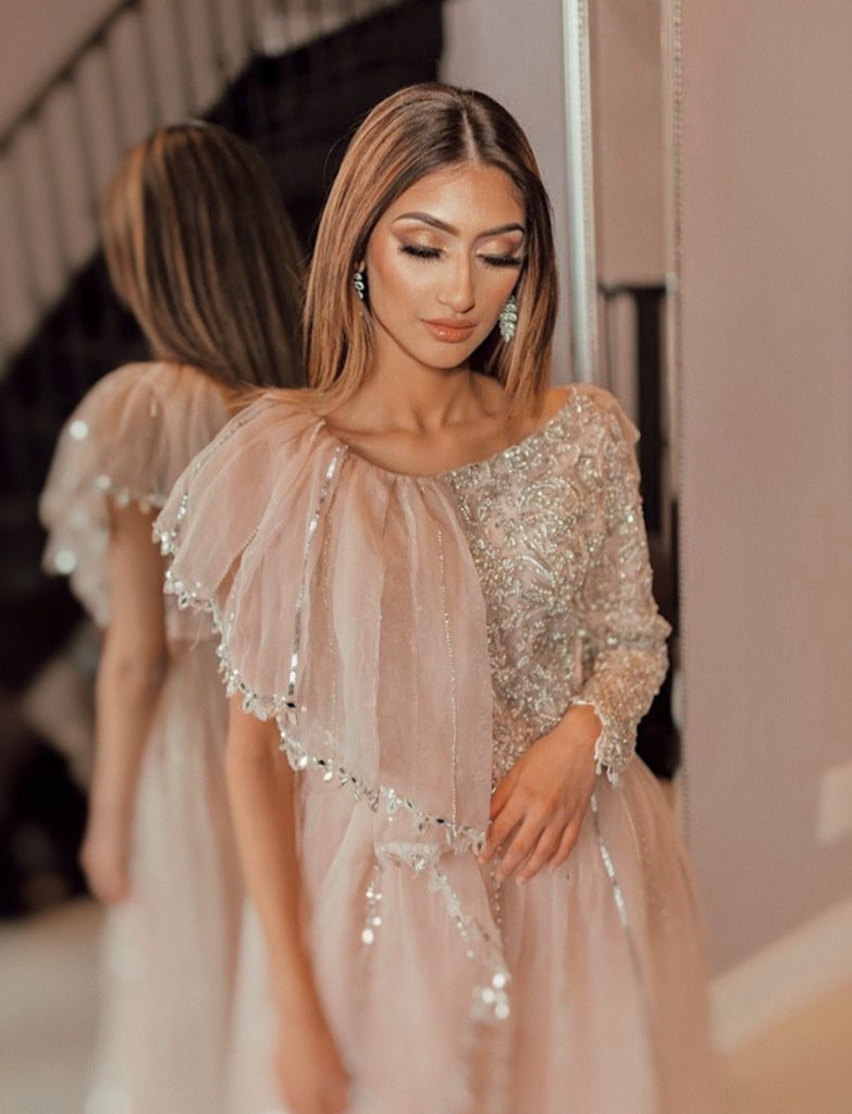 the outfit is adorned in reflective mirror work and delicate zardozi/crystal work.