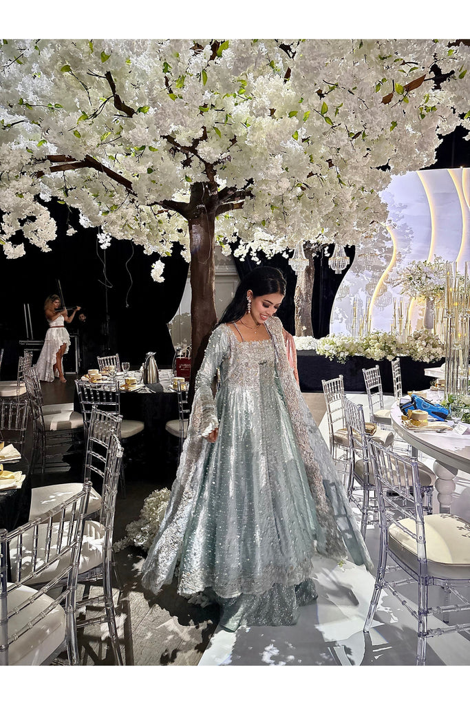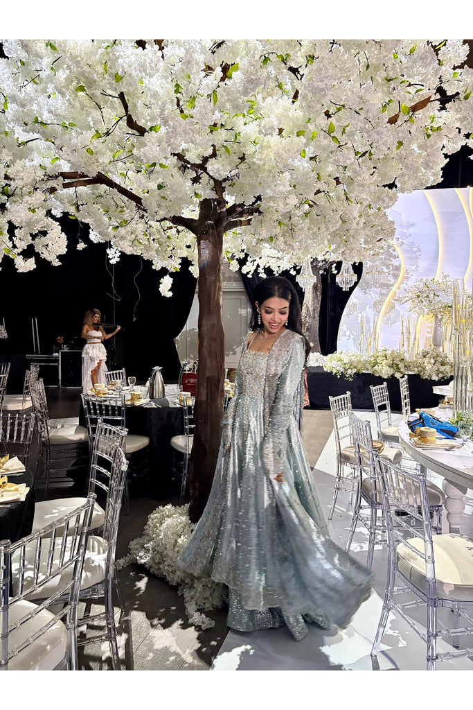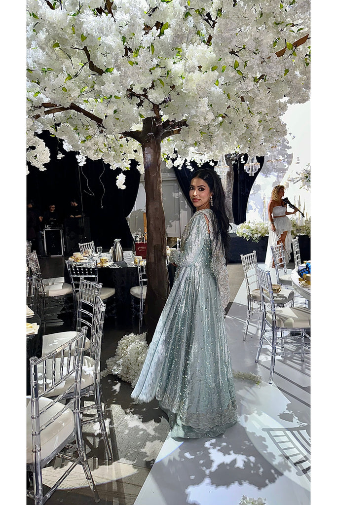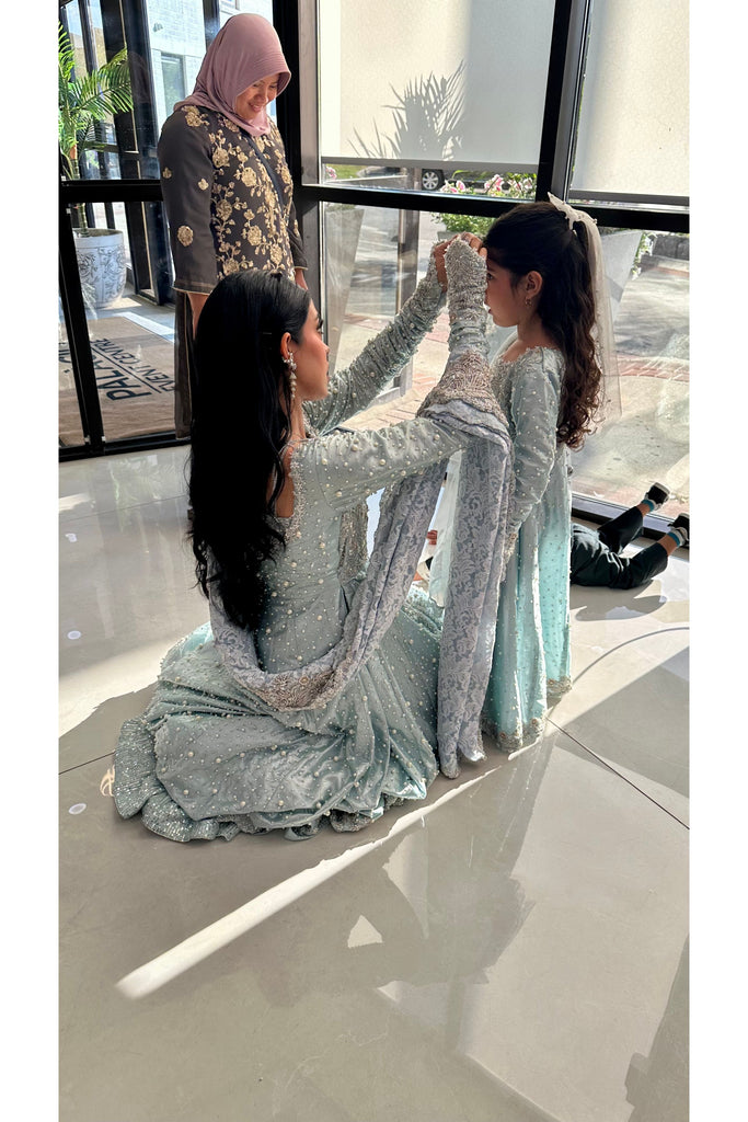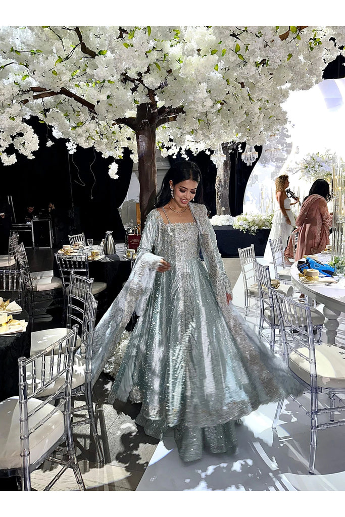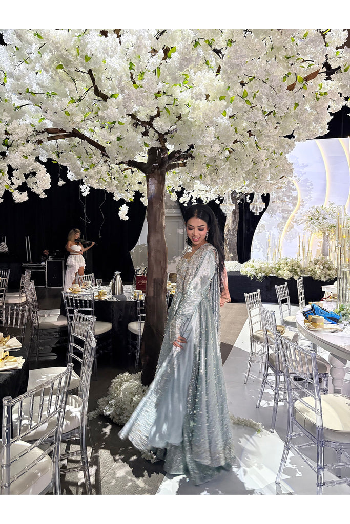 A glistening icey shade of blue on a pure tissue canvas, accentuated with pure tilla handwork, dabka, zardozi & crystal work.
