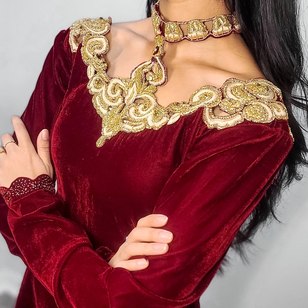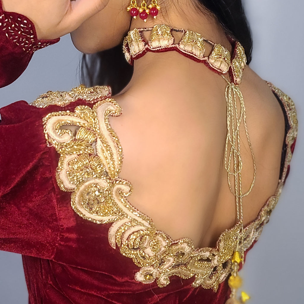 A lushious velvet open peplum top with a detailed handworked neckline (front and back) and attached choker tie.