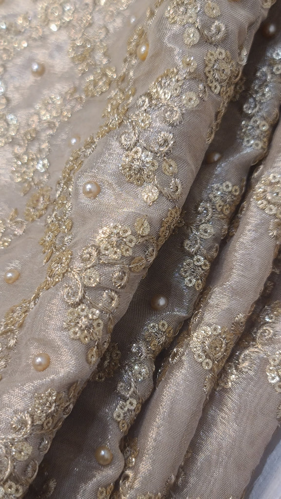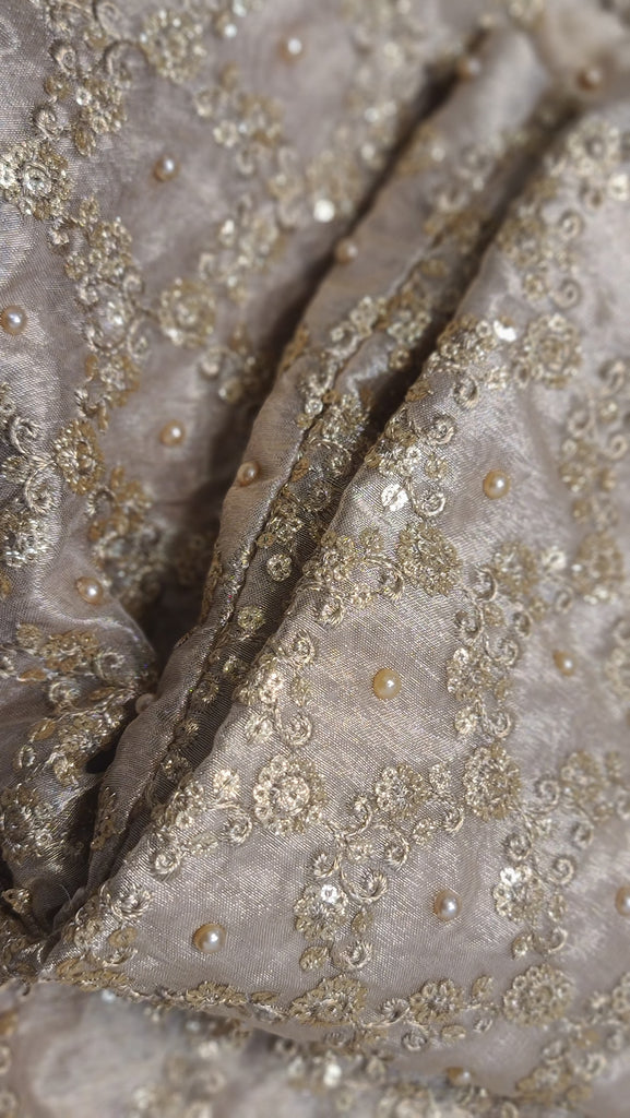 Paired with a embroidered tissue wide leg pant encrusted with irridescent gold tone pearls.