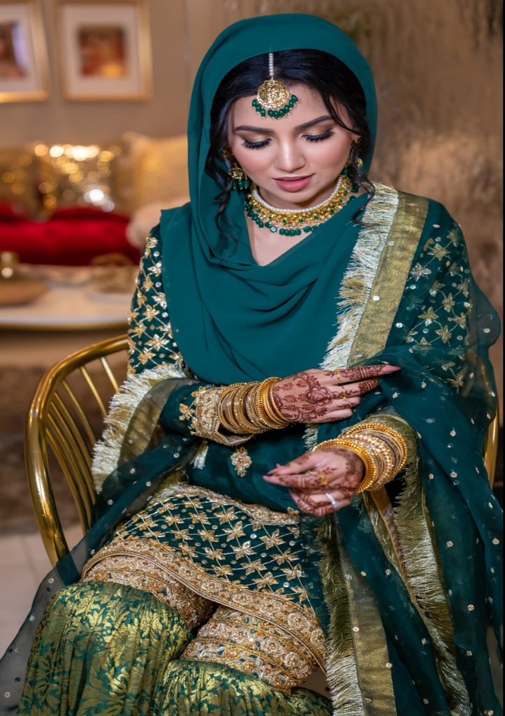 The look is completed with an atlas jamawar gharara with a thick border of handwork on the knee seams with the perfect flare and silhouette.